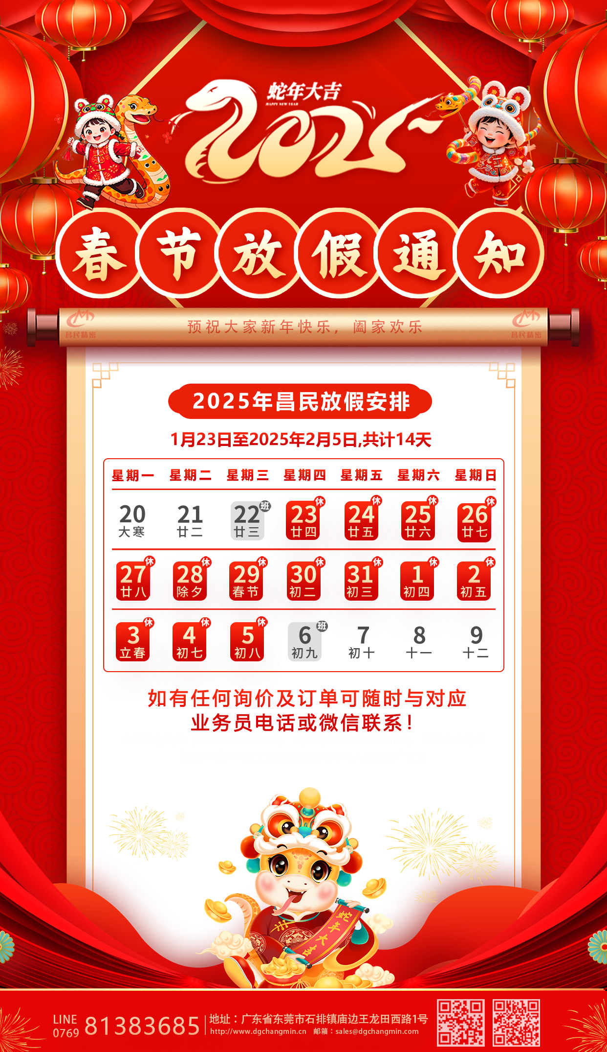 值此新春佳节来临之际,为让大家拥有一个快乐而充实的春节,根据国家相关规定并结合我司实际情况放假通知安排如下:1月23日至2025年2月5日,共计14天,2025年2月6日开工正式上班。期间,大家可以尽情享受与家人团聚的美好时光,感受浓浓的年味! 在此,昌民全体同仁预祝大家新春快乐,阖家幸福,万事如意!最后,再次衷心感谢新老客户在过去一年里的支持与帮助,让我们共同期待2025年,大家一起携手前行,共创辉煌!
